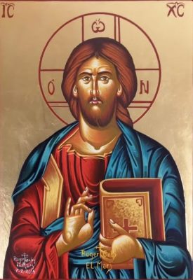 éLes icônes du Christ Sauveur ou Pantocrator sont aussi très populaires. Le Christ y est représenté en buste, tenant l’Évangile de la main gauche et bénissant de la main droite. Si l’Évangile est ouvert, c’est le Christ Sauveur. S’il est fermé, c’est le Pantocrator. Il porte une tunique bleu clair pour la divinité, et un manteau rouge pour l’humanité. Son teint est brun, ses traits sont moyen-orientaux.